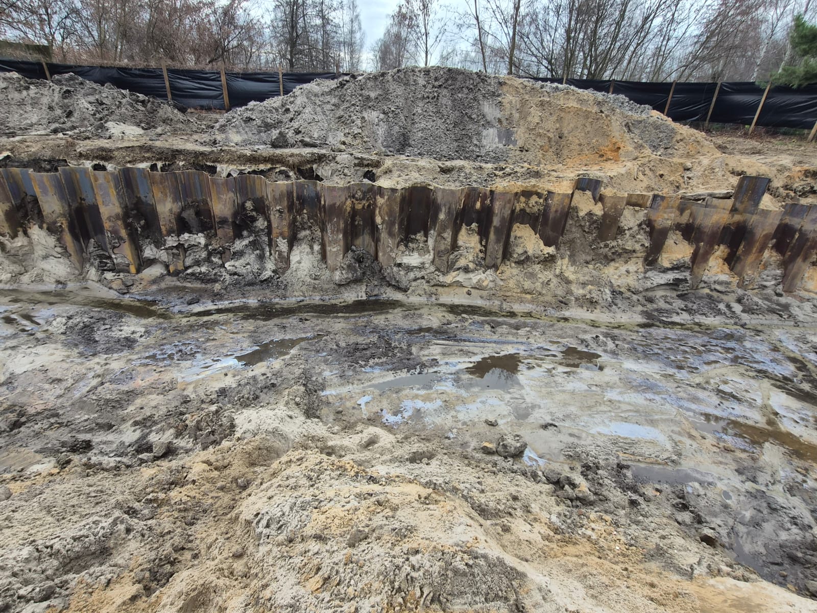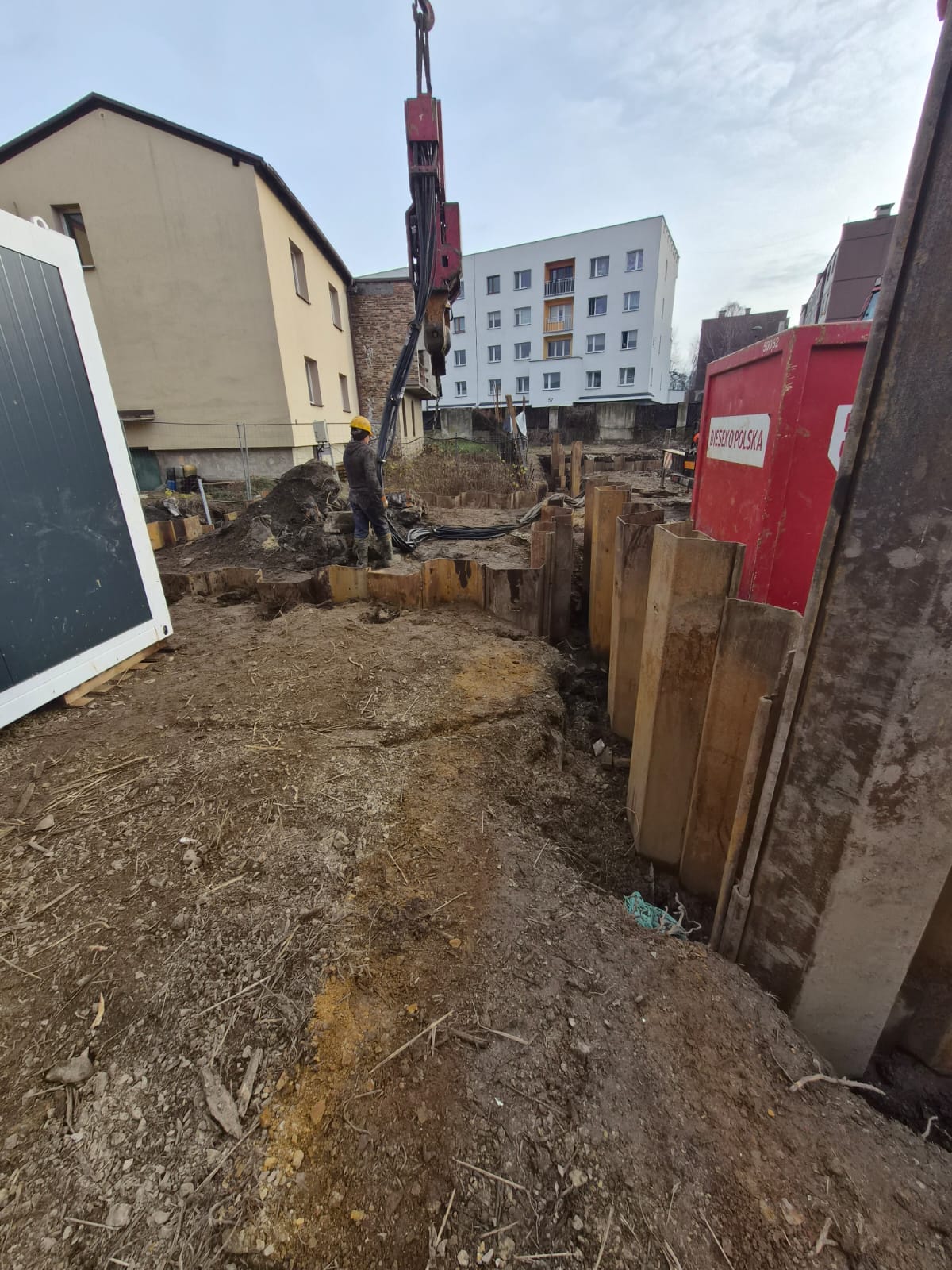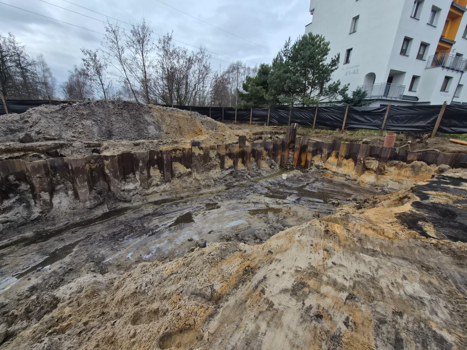 Realizacja tymczasowego zabezpieczenia wykopu z grodzic stalowych dla Budowy budynku wielorodzinnego z garażem podziemnym przy ul. Akacjowej w Sosnowcu.