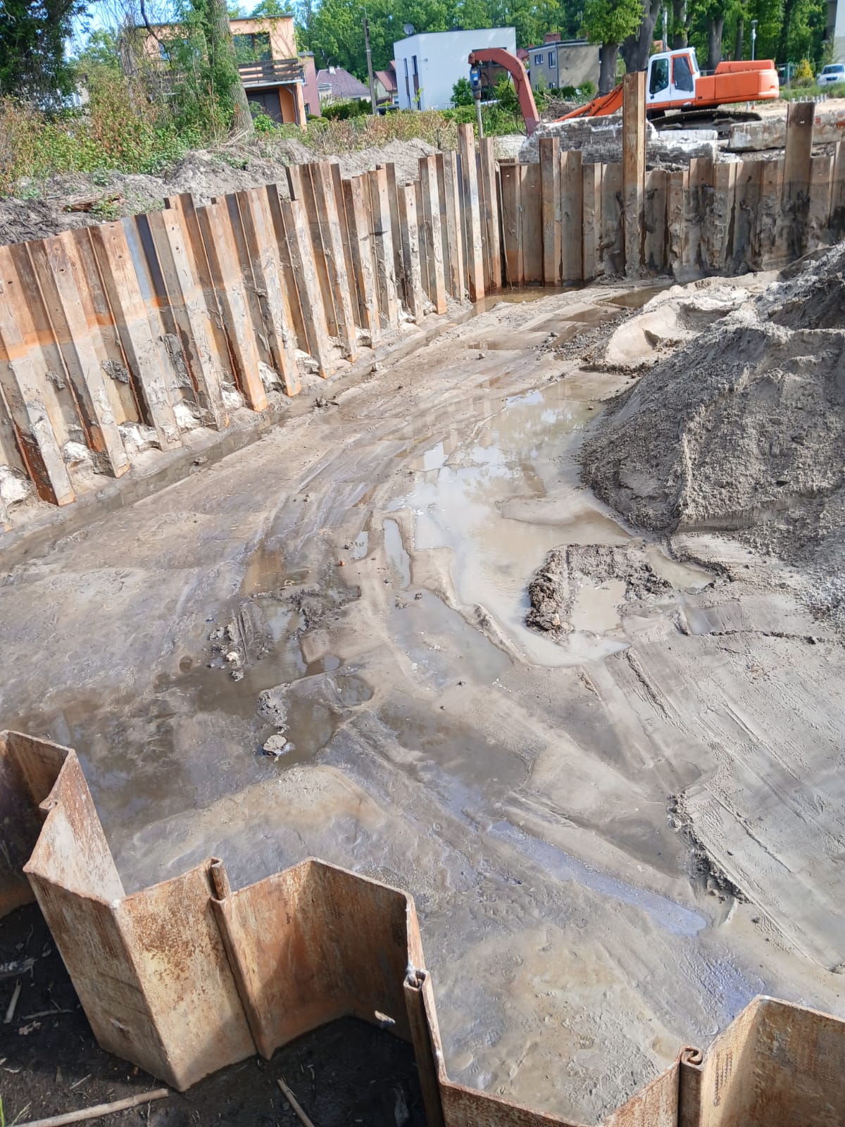 Zabezpieczenie wykopu z grodzic stalowych pogrążanych metodą wibracyjną wraz z narożnym wzmocnieniem ramą HEB – ” Budowa Stobrawskiego Centrum Seniora ” w Kluczborku