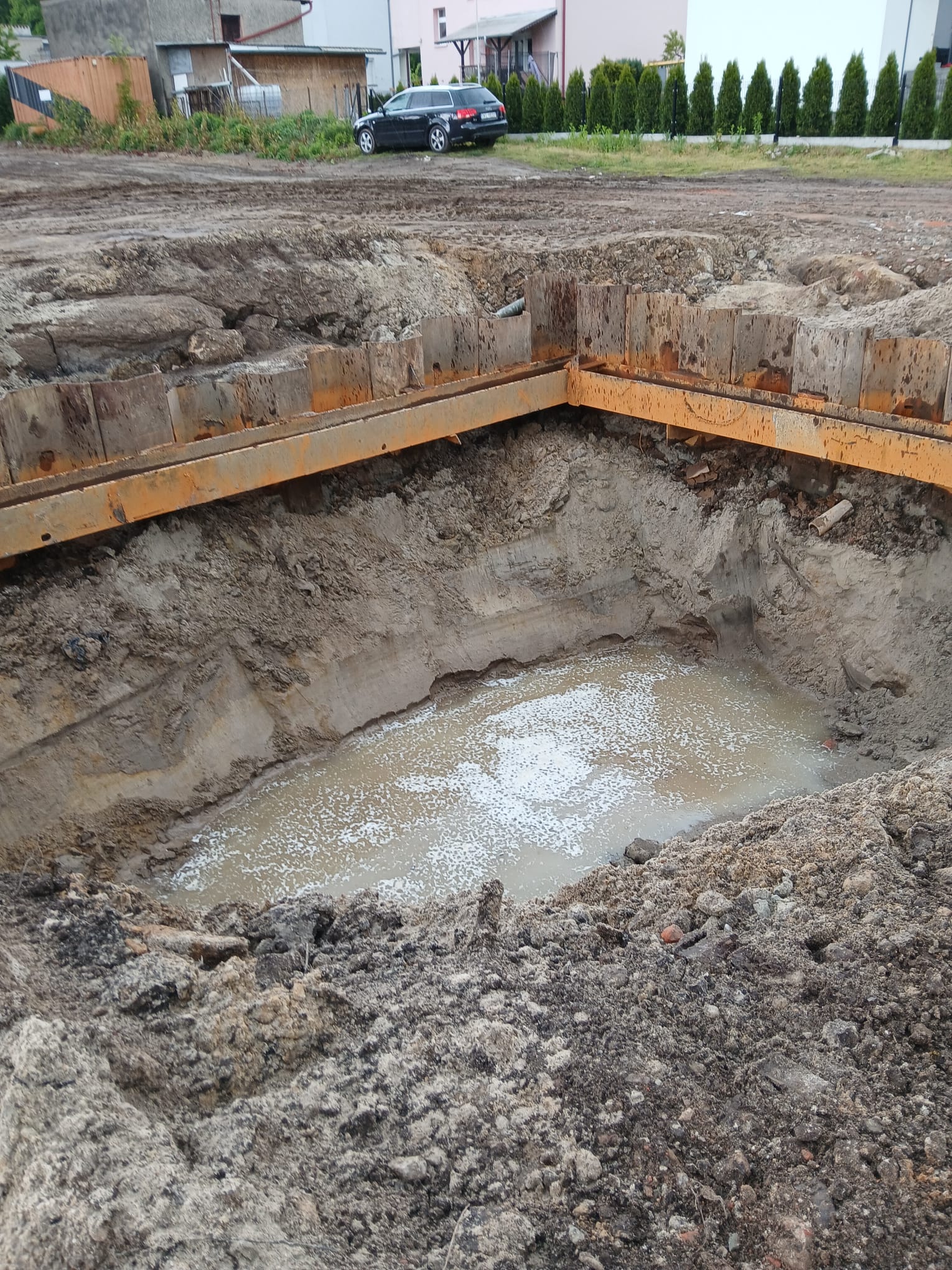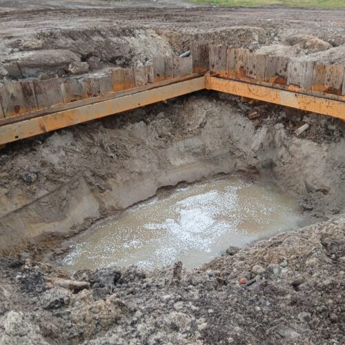 Zabezpieczenie wykopu z grodzic stalowych pogrążanych metodą wibracyjną wraz z narożnym wzmocnieniem ramą HEB – ” Budowa Stobrawskiego Centrum Seniora ” w Kluczborku