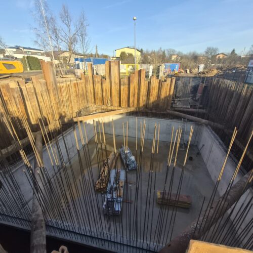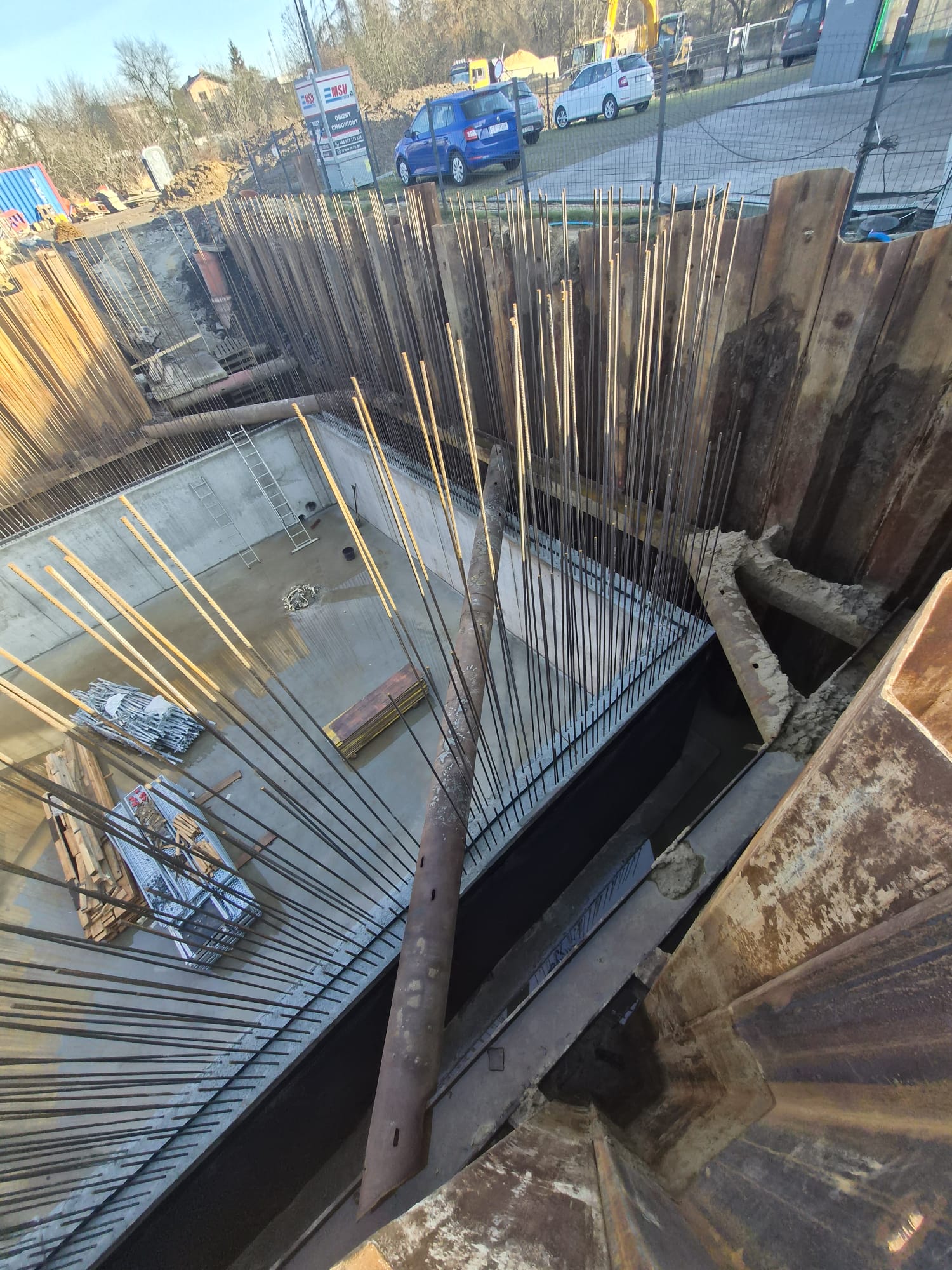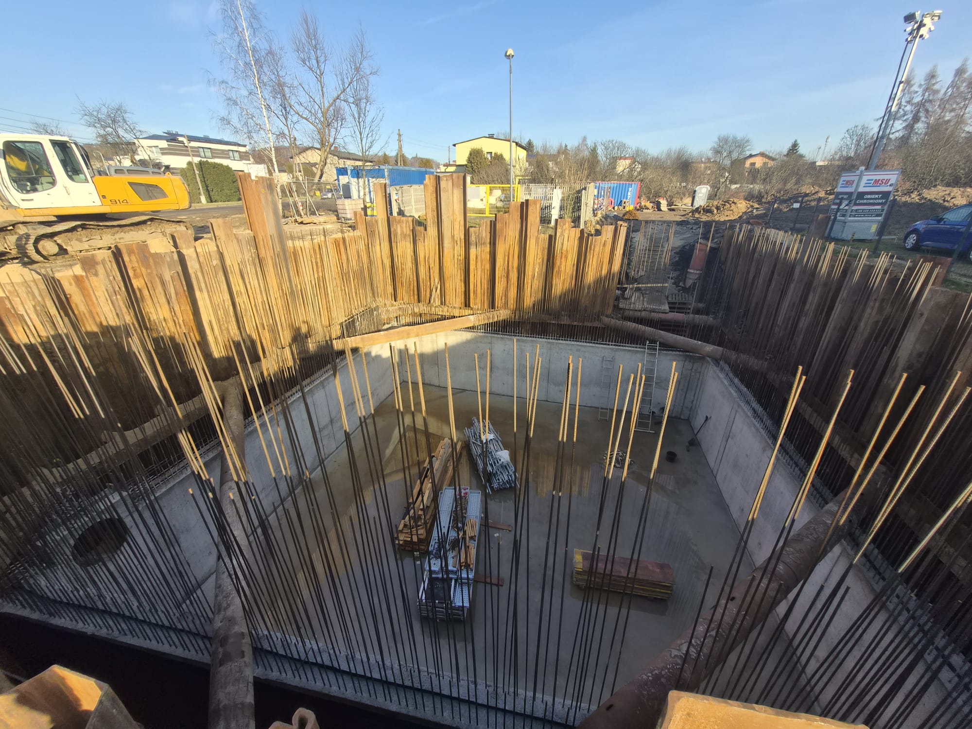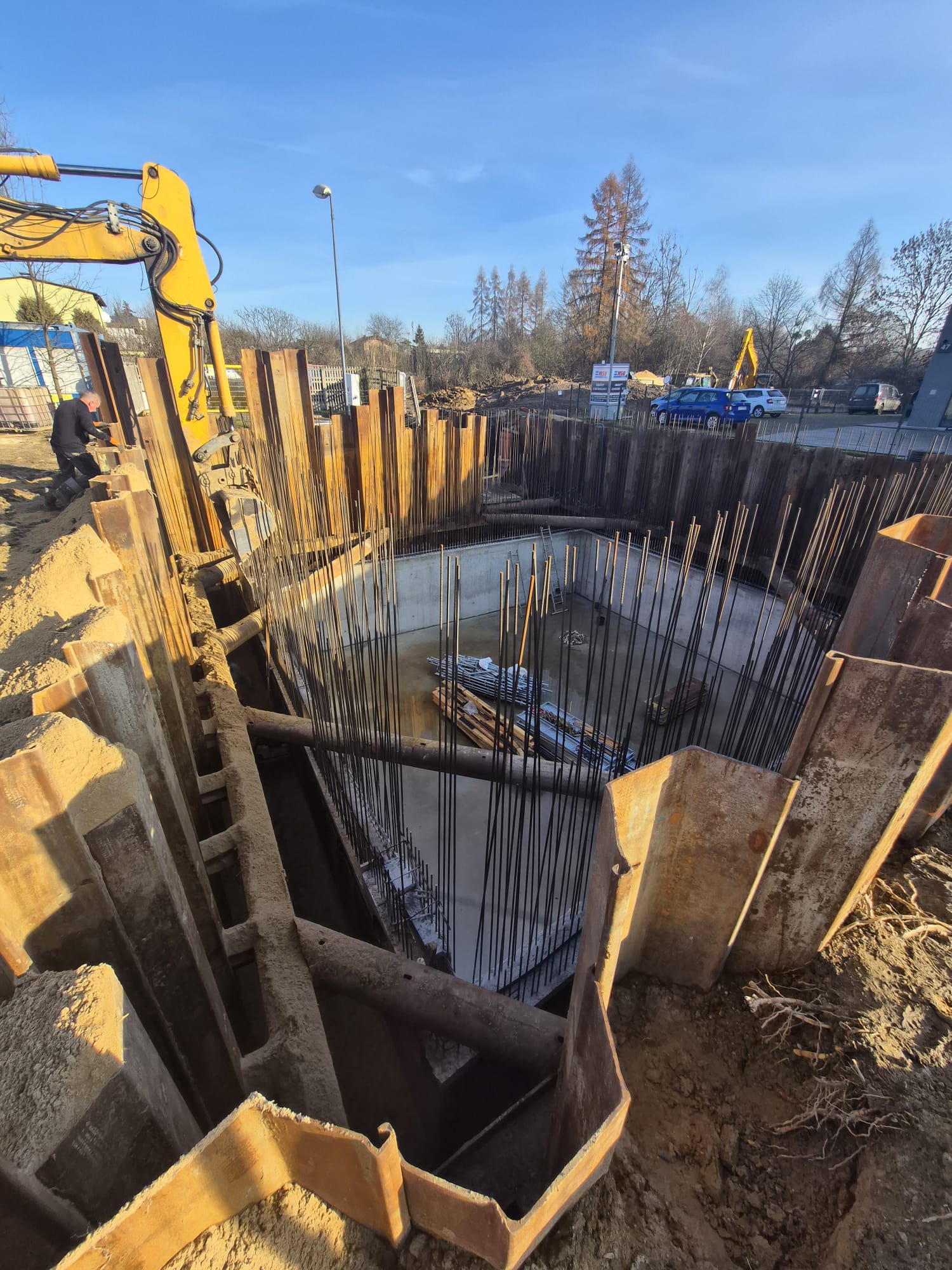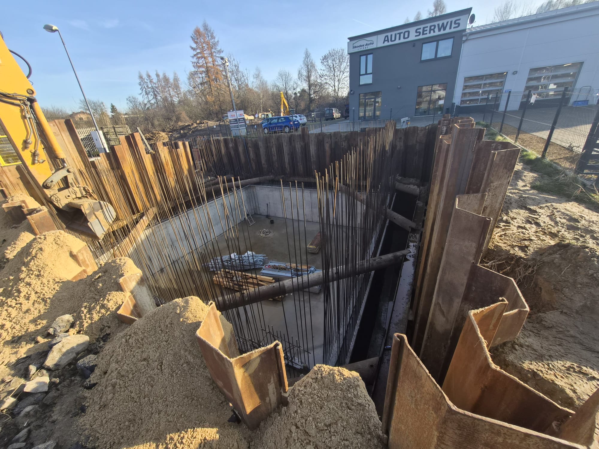 Zabezpieczenie wykopu z grodzic stalowych tymczasowych – komora wraz z ramą Heb oraz rozparciami rurowymi.